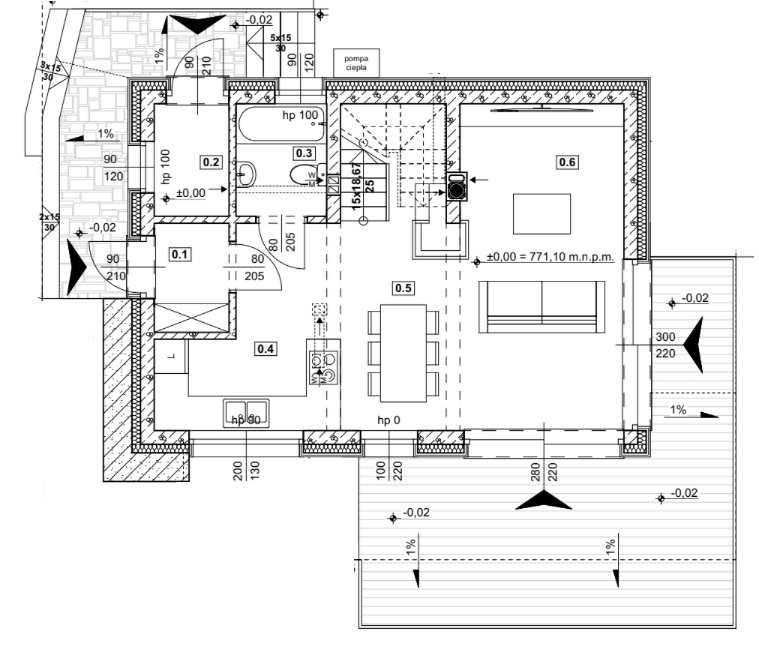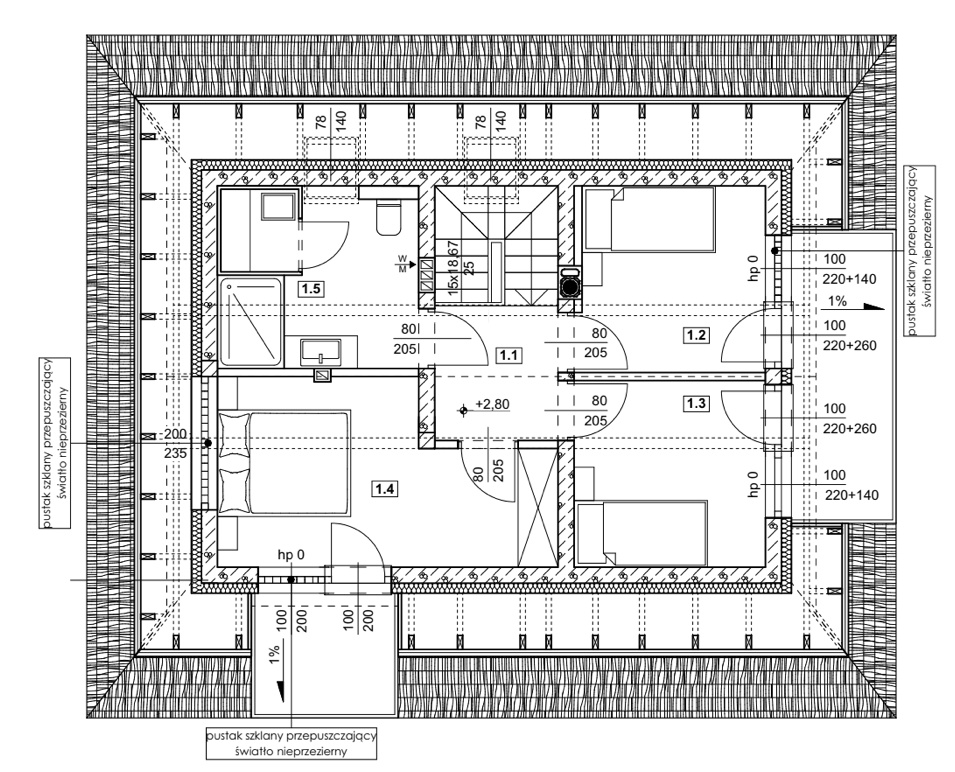 *Ściany zewnętrzne PARTERU – SCM35 o współczynniku przenikania ciepła U=0,147 W/m2K: warstwa nośna 15 cm (beton C30/37, stal A III-N), 18 cm styropianu grafitowgo, ściany kolankowe, szczytowe zintegrowane z drewnianą więźbą dachową.