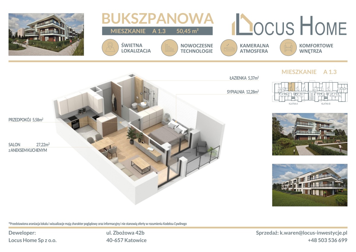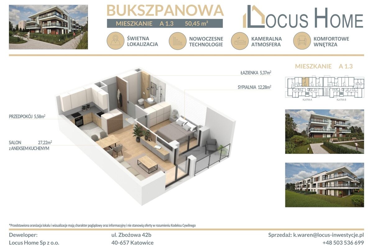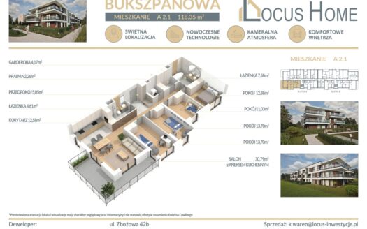 Spółka LOCUS HOME to DEWELOPER który realizuje inwestycje mieszkaniowe na terenie Katowic od wielu lat. NOWA inwestycja na ulicy BUKSZPANOWEJ (obok nr 19) w Piotrowicach to nowoczesny apartamentowiec w doskonałej lokalizacji Katowic.