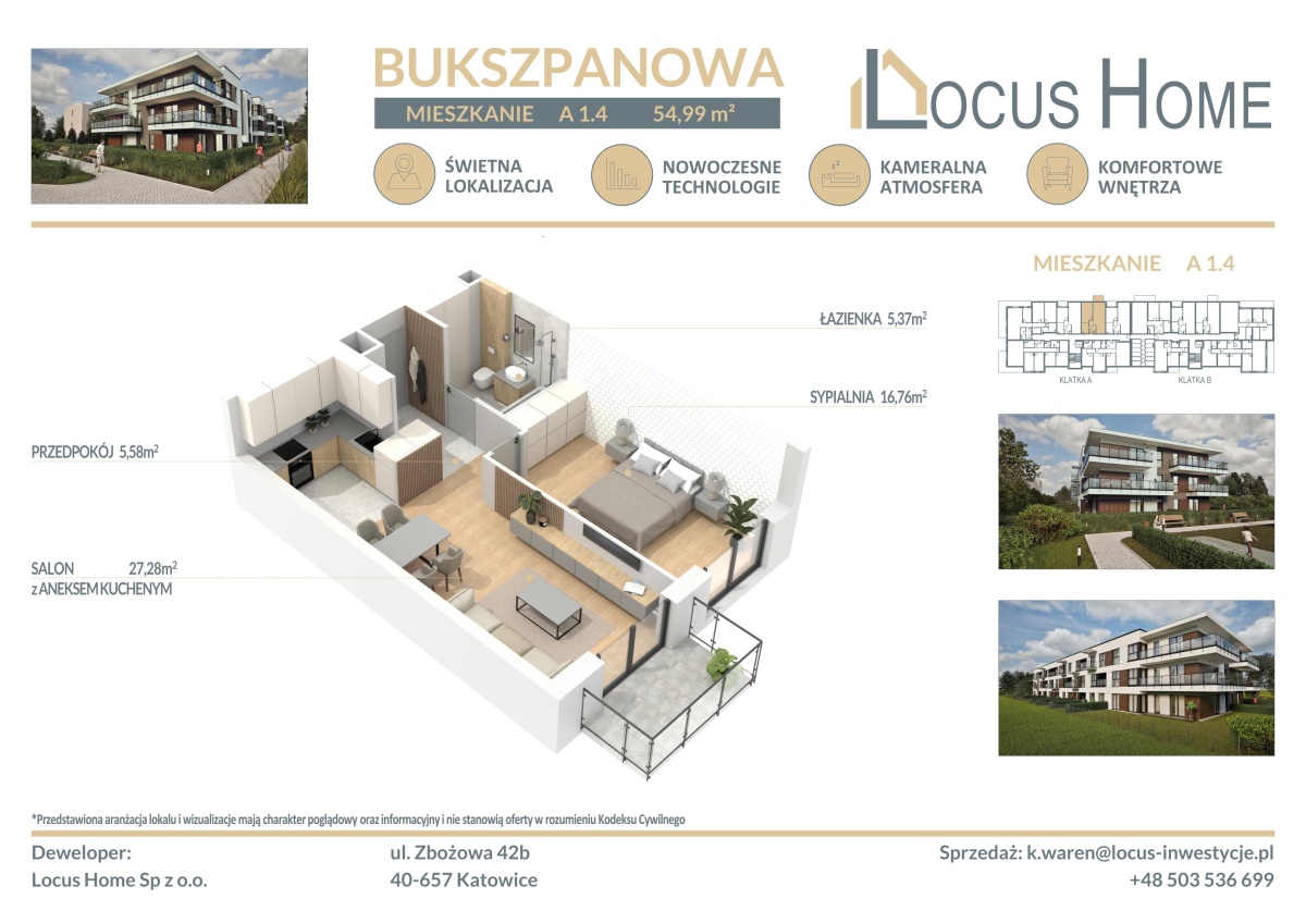 Spółka LOCUS HOME to DEWELOPER który realizuje inwestycje mieszkaniowe na terenie Katowic od wielu lat. NOWA inwestycja na ulicy BUKSZPANOWEJ (obok nr 19) w Piotrowicach to nowoczesny apartamentowiec w doskonałej lokalizacji Katowic.