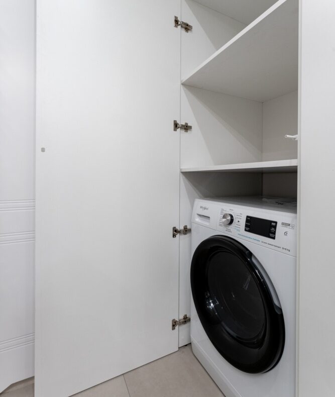 Łazienka (6,5 m²) – z wanną, prysznicem walk-in, szafką z dwiema umywalkami oraz zabudową z pralko-suszarką.