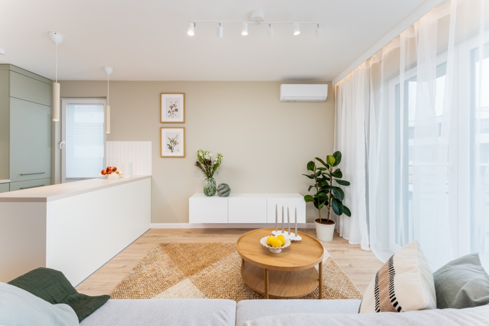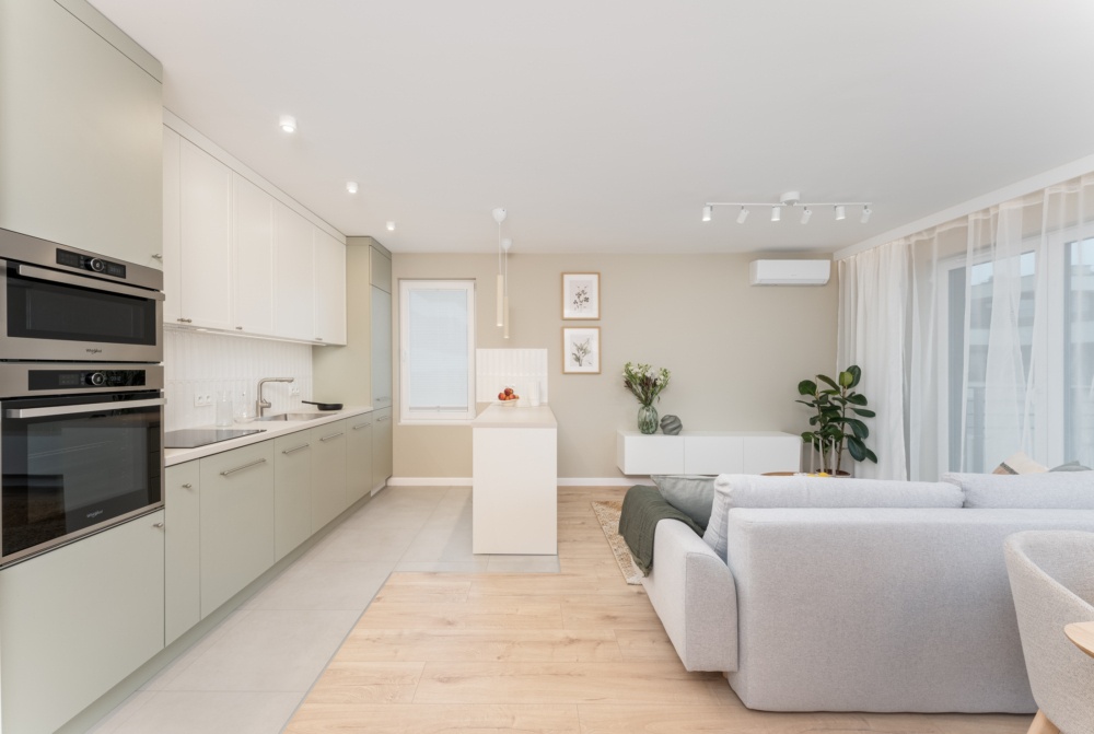 Przestronny salon z aneksem kuchennym (31,08 m²) – ekspozycja na 3 strony świata, z klimatyzacją, kompletną zabudową kuchenną i sprzętem AGD (płyta indukcyjna, piekarnik, zmywarka, lodówka, okap).