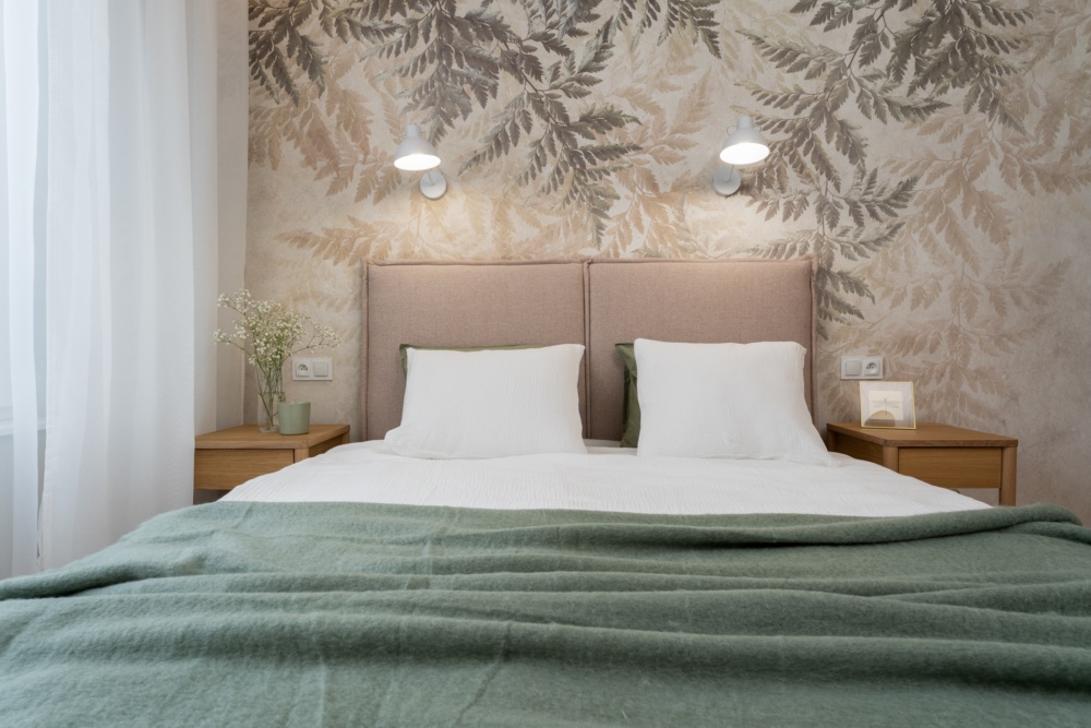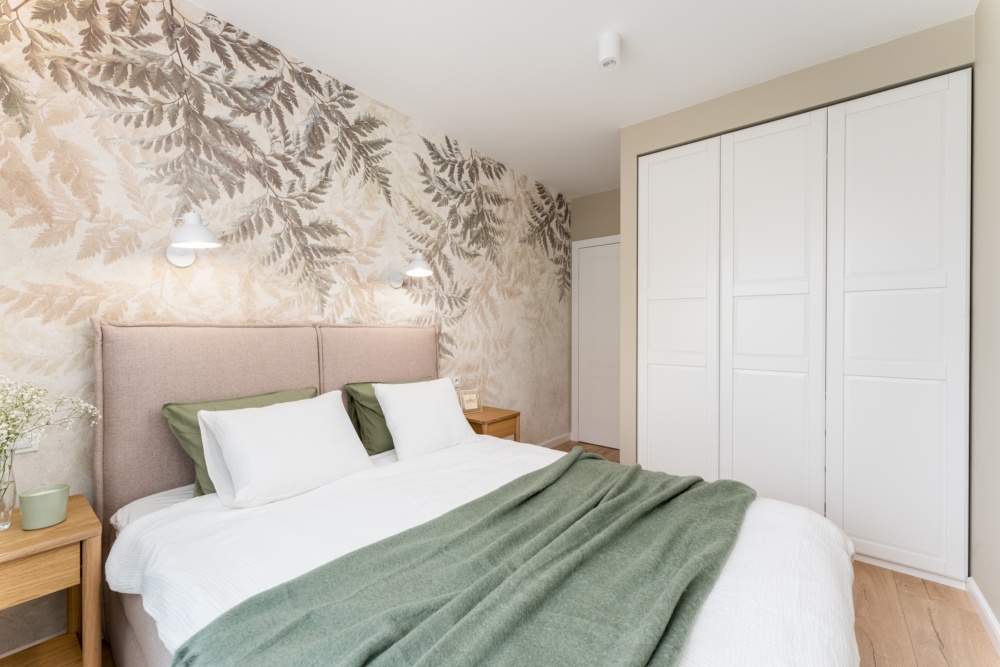 Sypialnia główna (12 m²) – komfortowe łóżko, szafy, szafki nocne.
