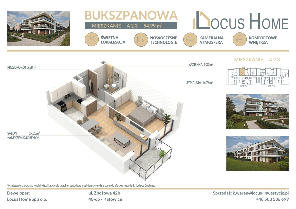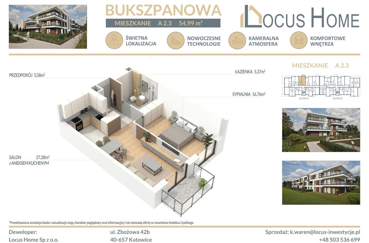 Spółka LOCUS HOME to DEWELOPER który realizuje inwestycje mieszkaniowe na terenie Katowic od wielu lat. NOWA inwestycja na ulicy BUKSZPANOWEJ (obok nr 19) w Piotrowicach to nowoczesny apartamentowiec w doskonałej lokalizacji Katowic.