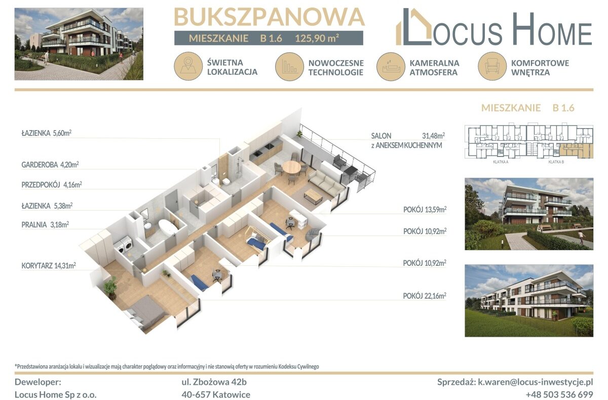 Spółka LOCUS HOME to DEWELOPER który realizuje inwestycje mieszkaniowe na terenie Katowic od wielu lat. NOWA inwestycja na ulicy BUKSZPANOWEJ (obok nr 19) w Piotrowicach to nowoczesny apartamentowiec w doskonałej lokalizacji Katowic.