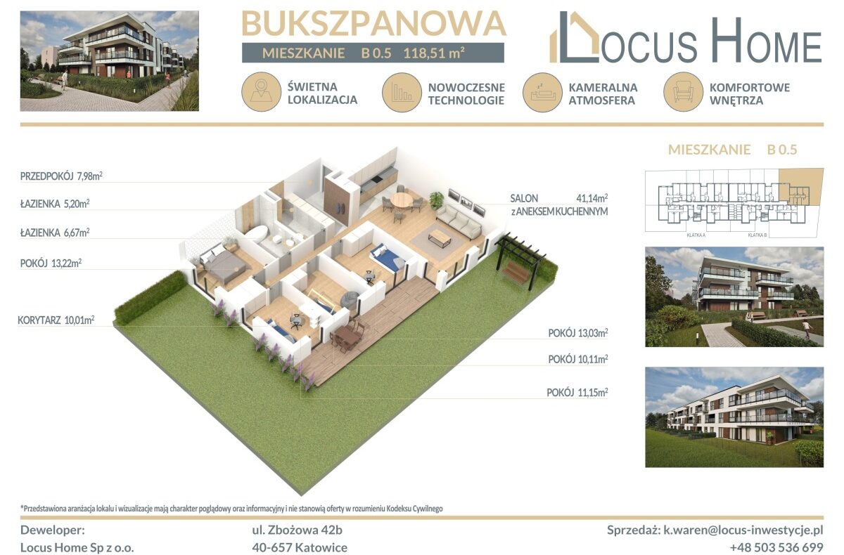 Spółka LOCUS HOME to DEWELOPER który realizuje inwestycje mieszkaniowe na terenie Katowic od wielu lat. NOWA inwestycja na ulicy BUKSZPANOWEJ (obok nr 19) w Piotrowicach to nowoczesny apartamentowiec w doskonałej lokalizacji Katowic.