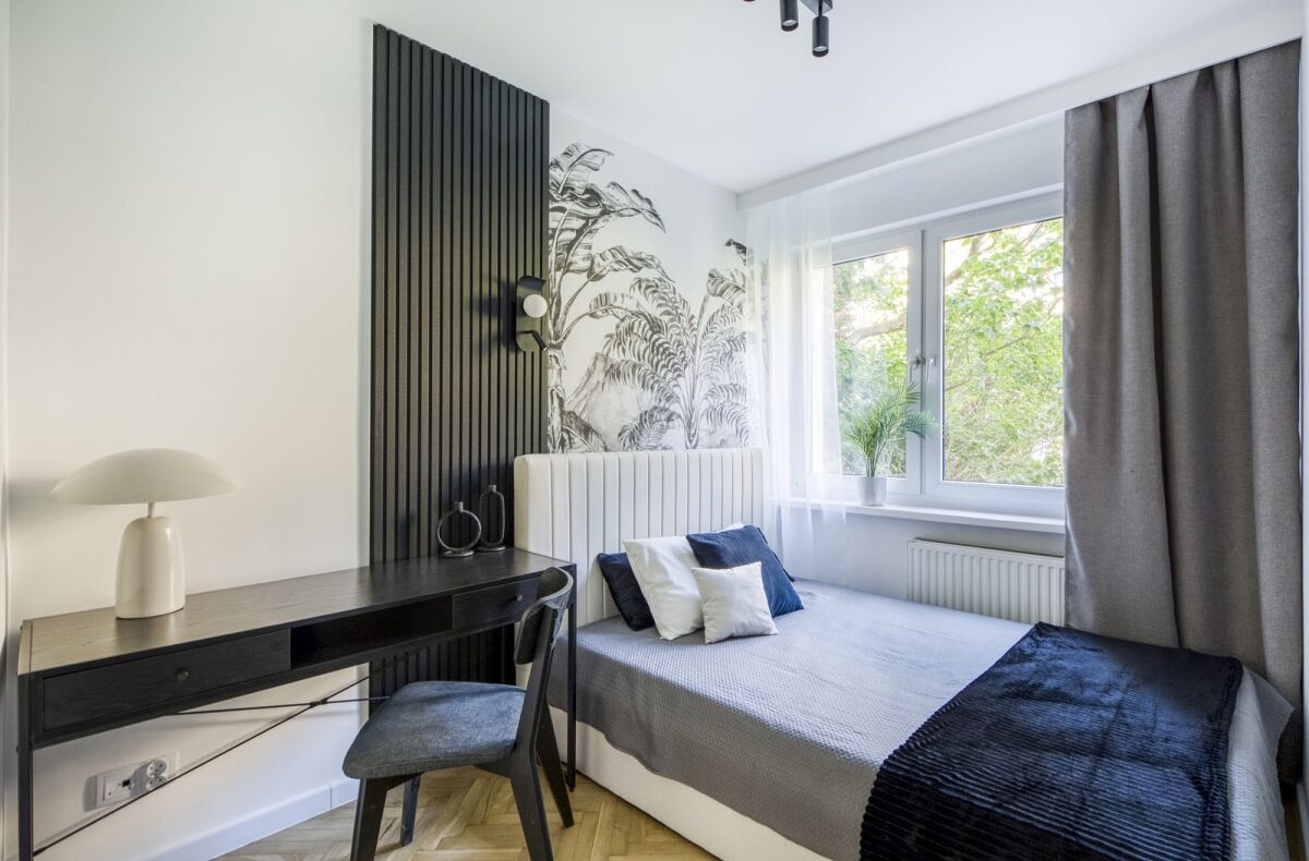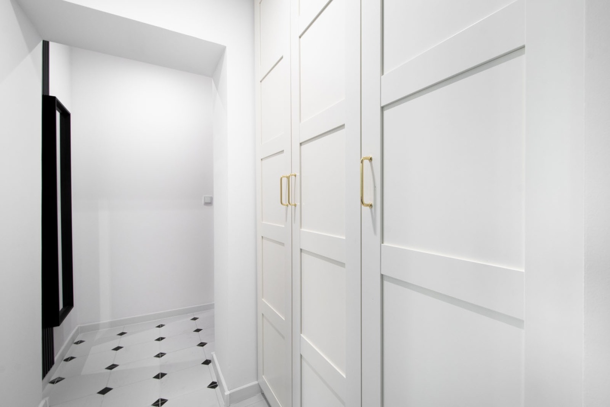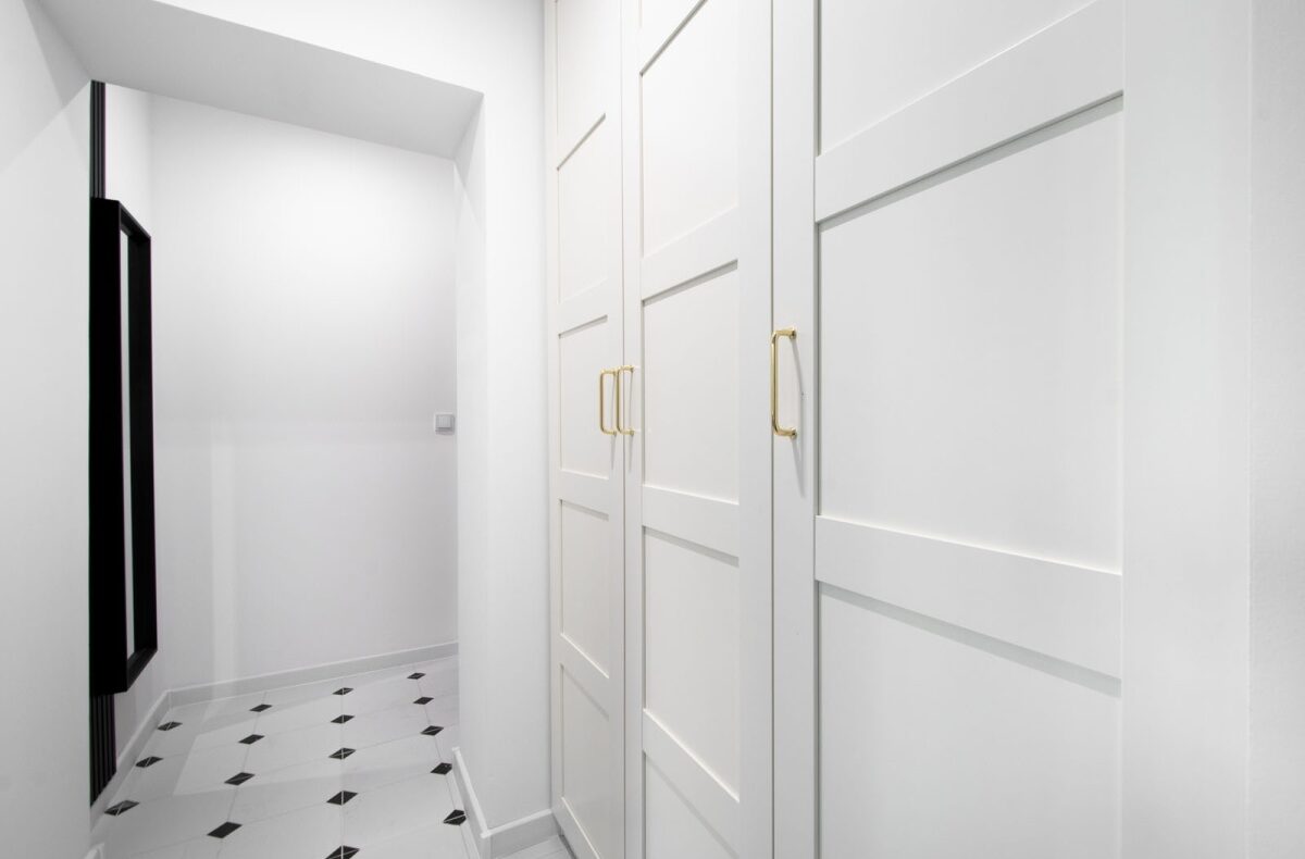 W mieszkaniu zamontowano aż trzy duże szafy oraz łóżko z pojemnikiem na pościel, a także rozkładaną kanapę w salonie.