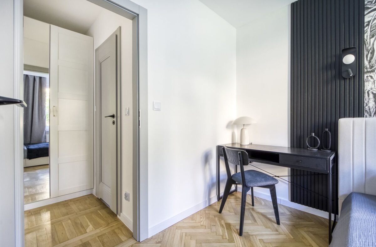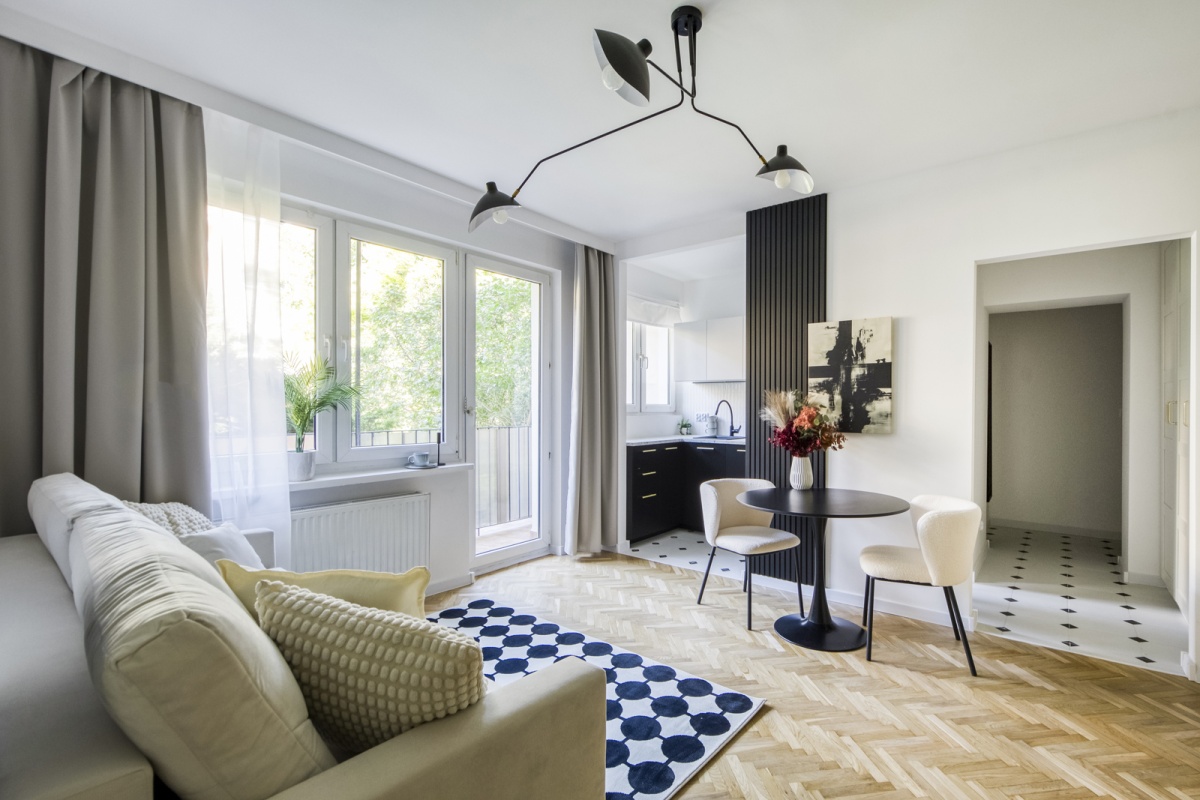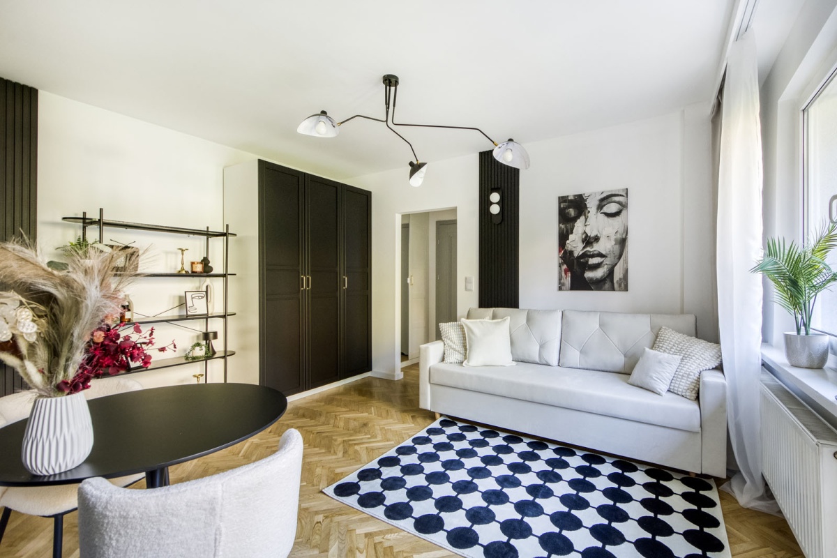 Appliances include: an oven, refrigerator, dishwasher, induction cooktop, and extractor hood. The apartment features three large wardrobes, a bed with storage, and a fold-out sofa in the living room. Thanks to the excellent layout, the apartment feels much larger than its size suggests. The bathroom features a large, comfortable shower and space for a washing machine. The oak parquet flooring has been sanded and left intact.
