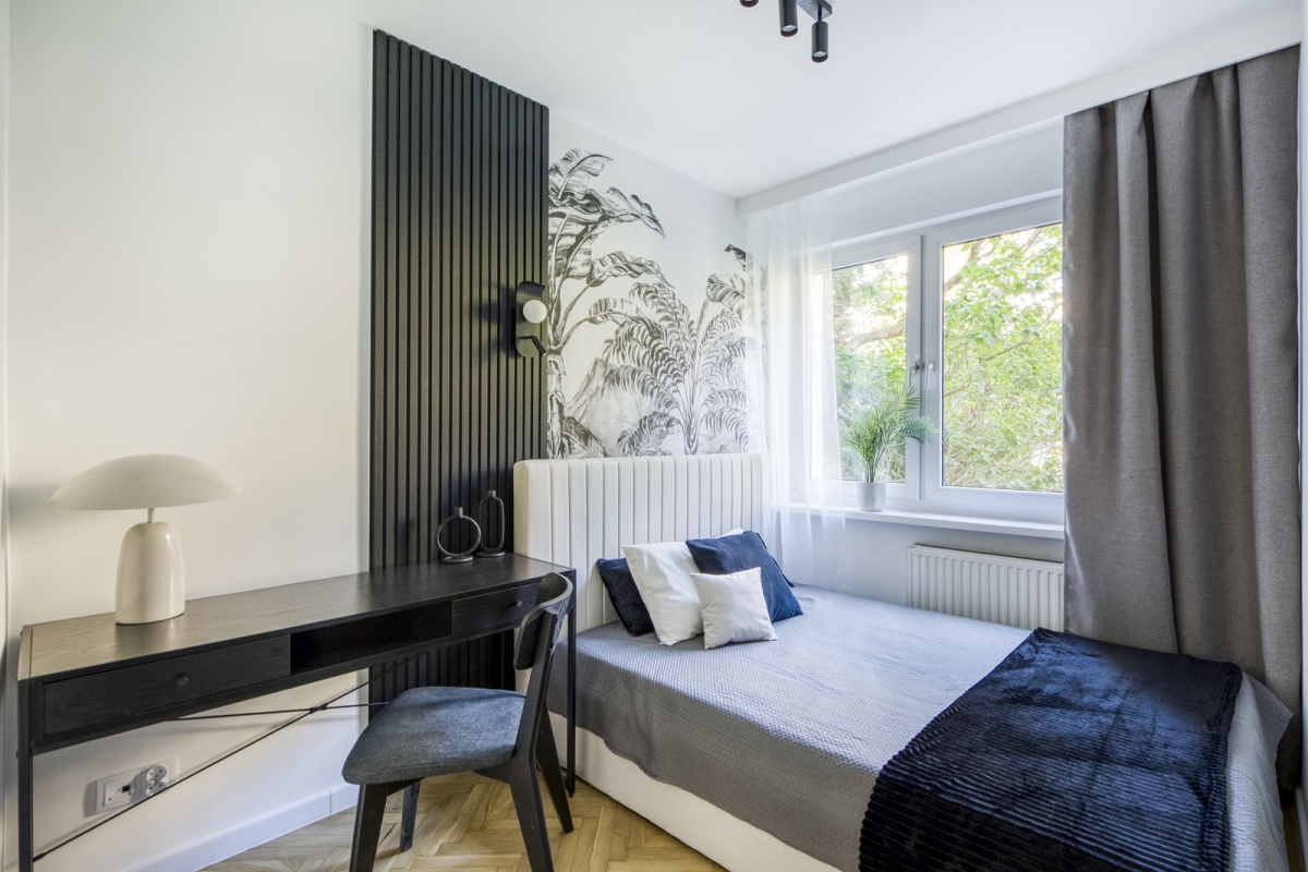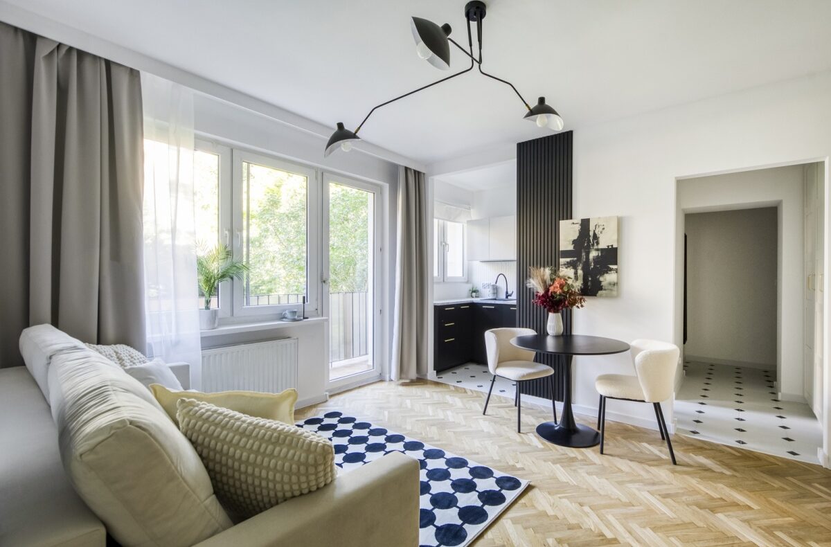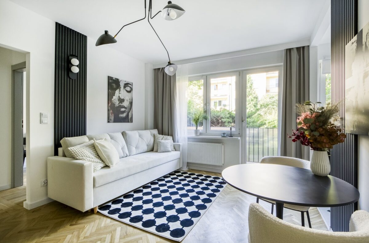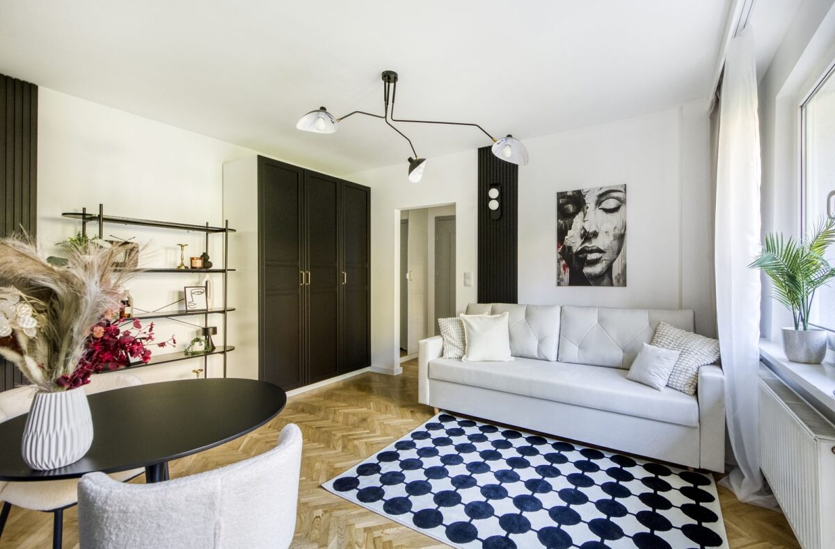 Appliances include: an oven, refrigerator, dishwasher, induction cooktop, and extractor hood. The apartment features three large wardrobes, a bed with storage, and a fold-out sofa in the living room. Thanks to the excellent layout, the apartment feels much larger than its size suggests. The bathroom features a large, comfortable shower and space for a washing machine. The oak parquet flooring has been sanded and left intact.
