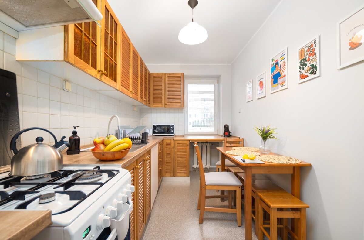 • Kuchnia jest wyposażona w talerze, sztućce, kubki, szklanki, garnki i patelnie.