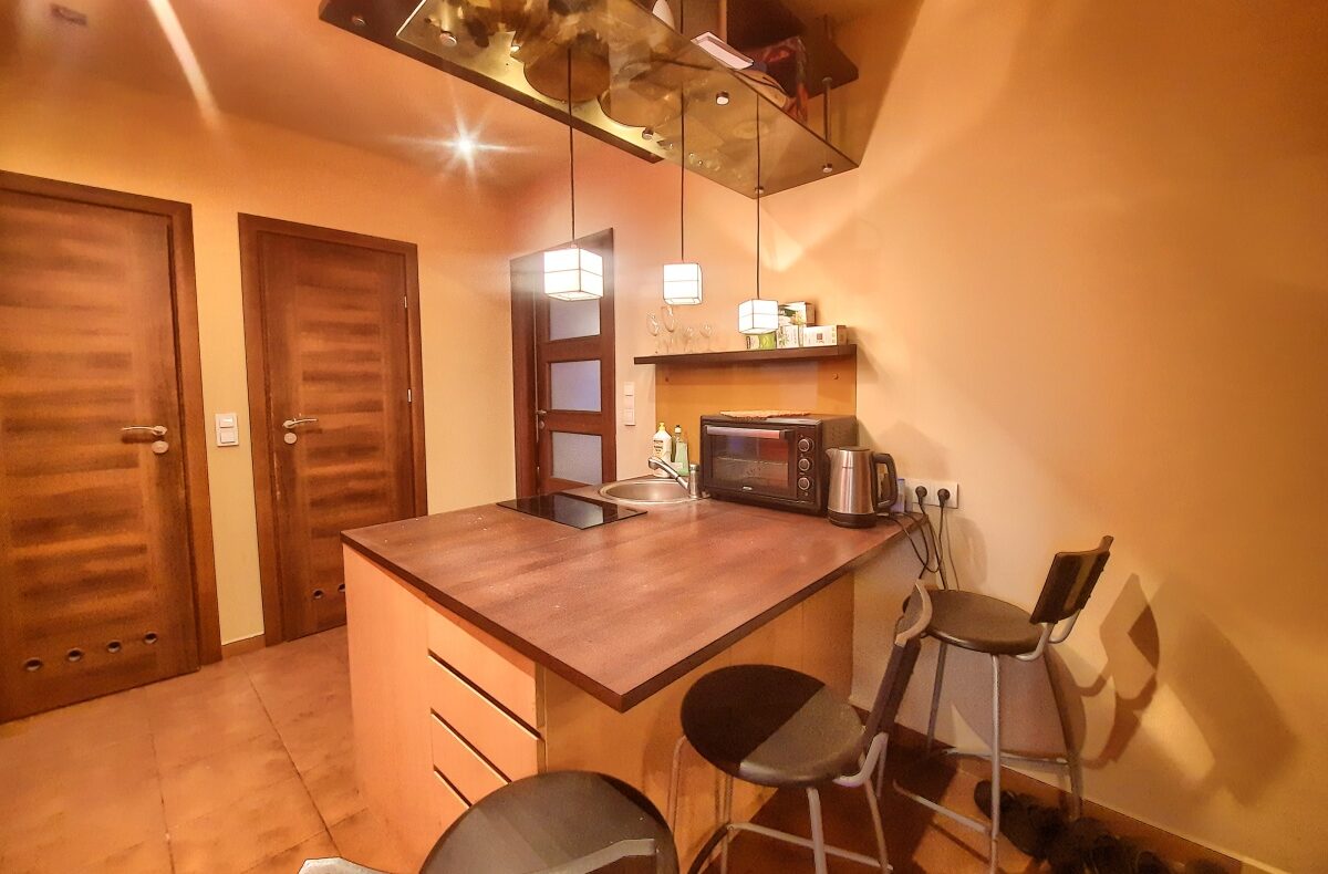 Aneks kuchenny umeblowany meblami na wymiar – wyspa, z wbudowanymi sprzętami AGD, zmywarką, kuchenką dwu płytową, lodówką. Nad wyspą zamontowany został sufit podwieszany z wmontowanymi reflektorami halogenowymi. Istnieje możliwość podłączenia większej czteropłytowej płyty grzewczej oraz piekarnika.