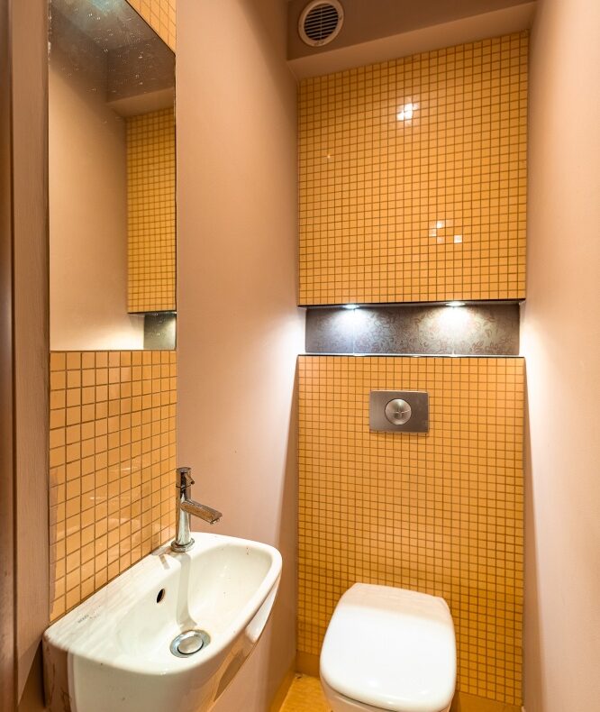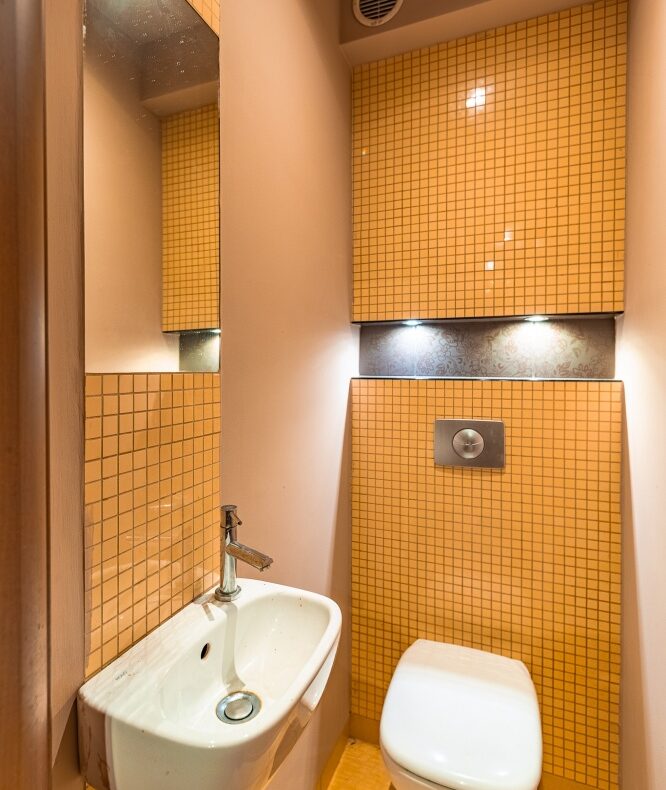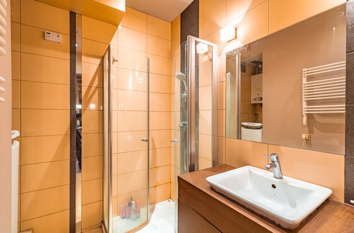 W łazience znajduje się umywalka, oraz kabina prysznicowa. Toaleta znajduje się w oddzielnym pomieszczeniu. W łazience i w toalecie na ścianach i podłodze położone są płytki ceramiczne.