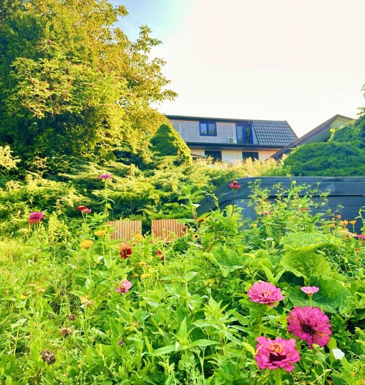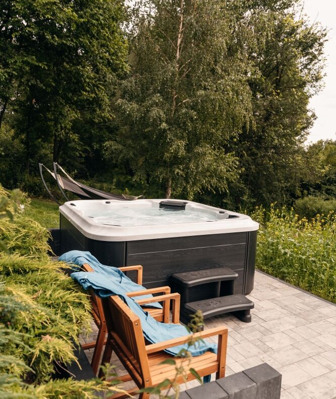 Strefa Relaksu: Jacuzzi z widokiem na Bug, strefa medytacji wśród zieleni, taras i ogród schodzący prosto do wody.