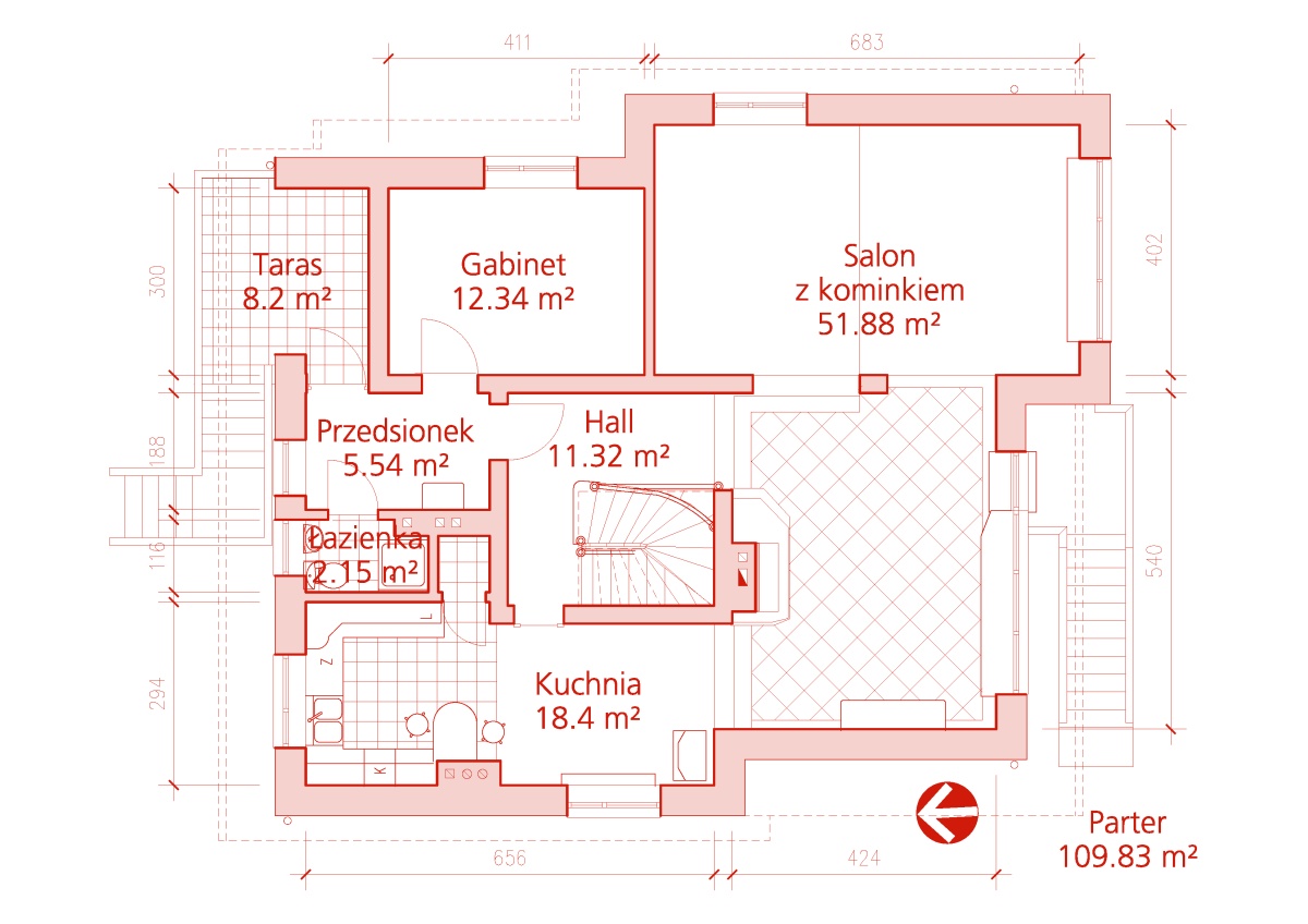 Zaletą domu jest duży 52 mkw otwarty salon z kominkiem, wielkość domu i możliwość wydzielenia odrębnych lokali mieszkalnych, oraz wielowarstwowe izolowane termicznie ściany murowane z cegły ceramicznej.