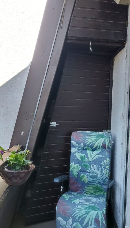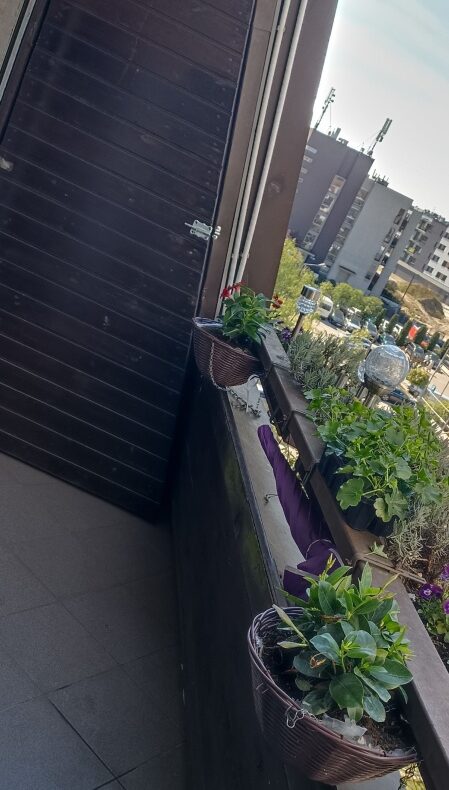 Balkon z widok na teren zielony osiedla (nie ma ryzyka budowy naprzeciwko okien), ze schowkami i z półkami po obu stronach (łącznie ok. 7 m2),