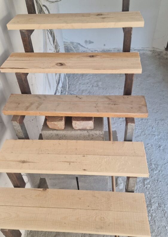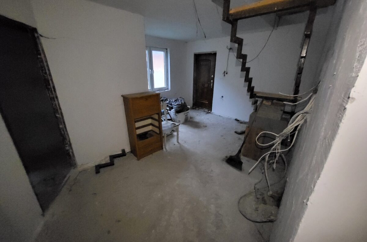 W części głównej domu znajduje się kominek do ogrzewania, a na piętro prowadzą drewniane schody. Przestrzeń dachowa jest częściowo ocieplona, co daje dodatkowe możliwości adaptacyjne.