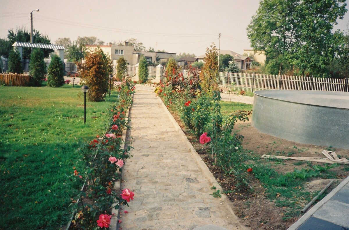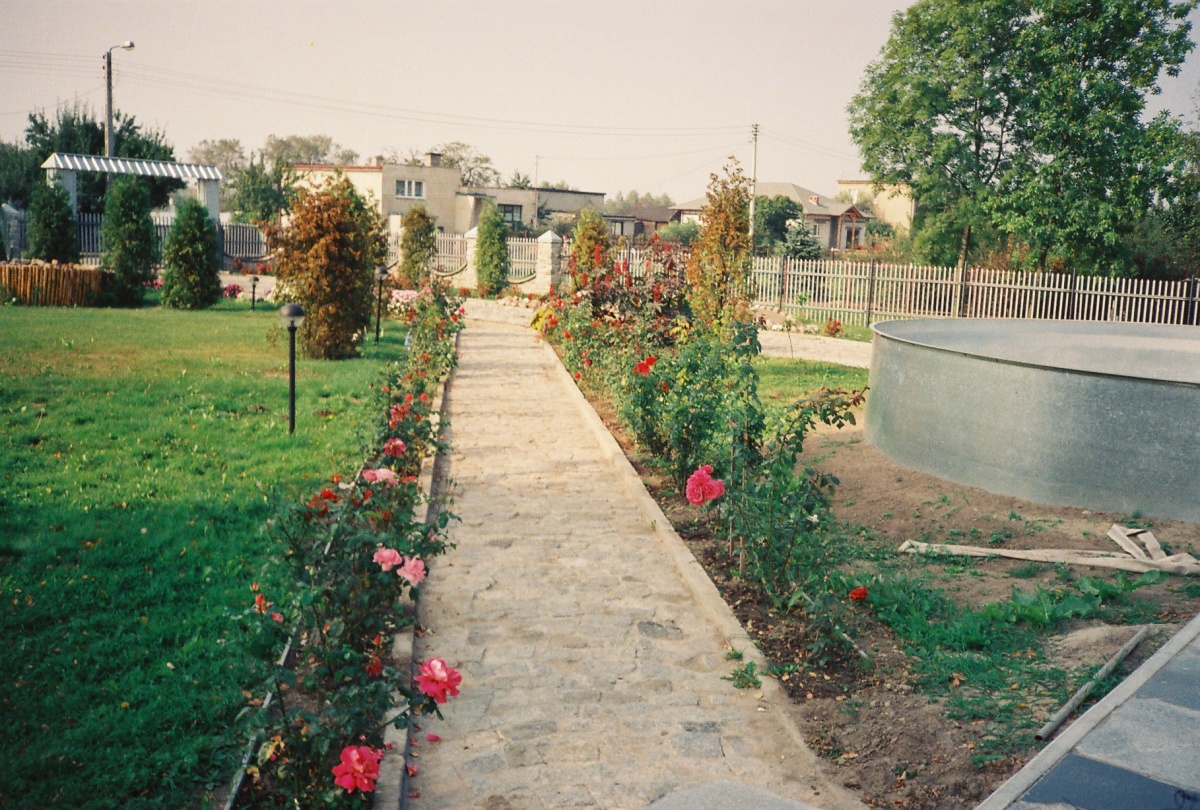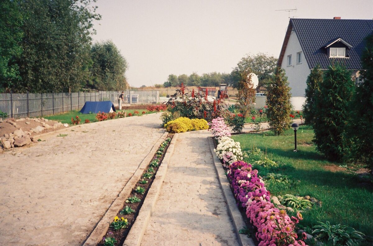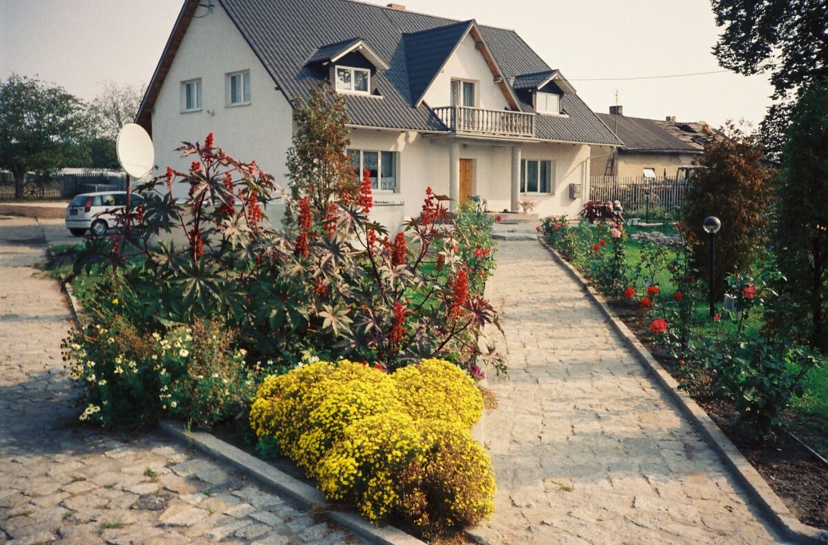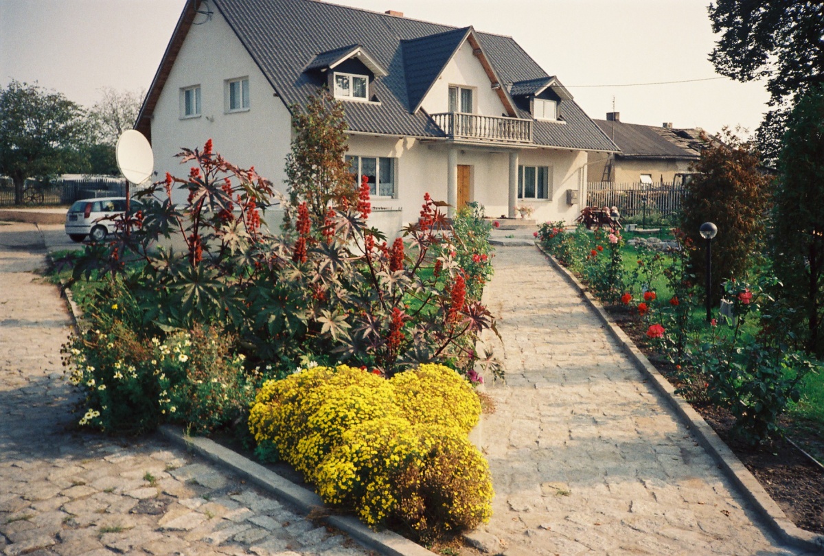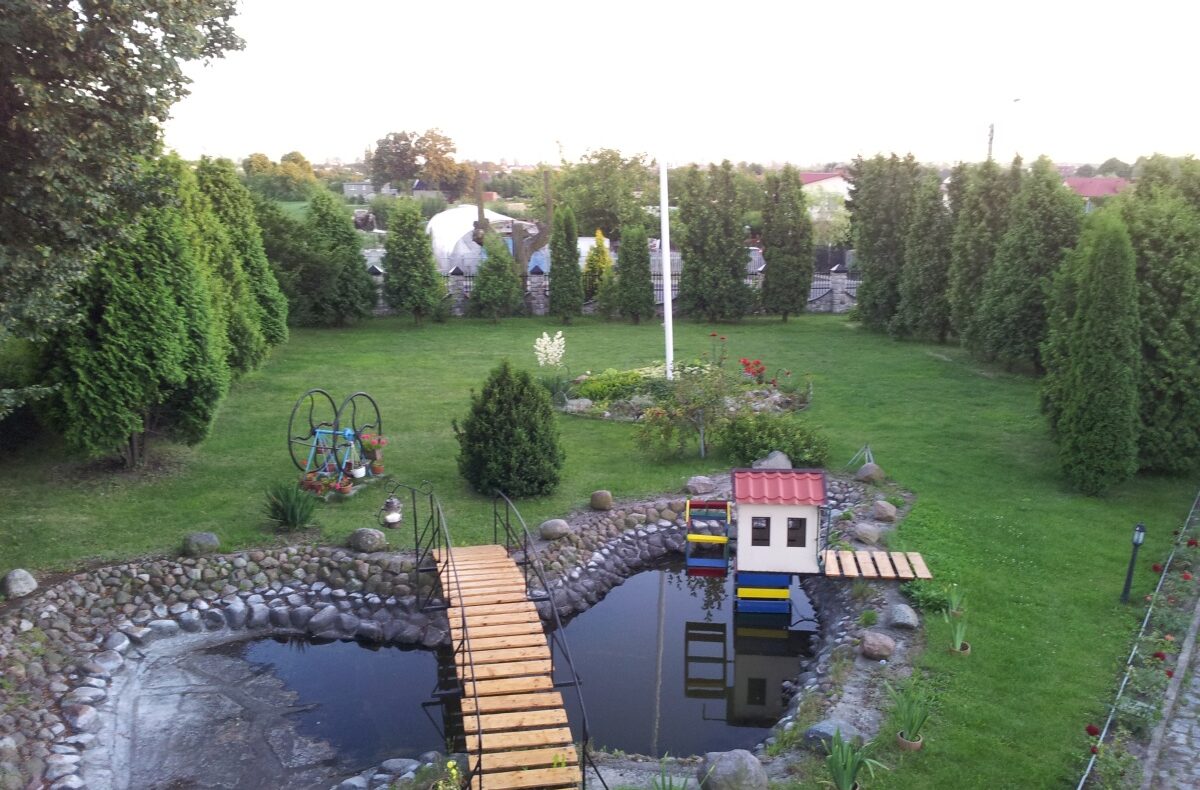 Na zewnątrz domu jest oczko wodne, basen z blachy oraz teren zielony obsadzony tujami