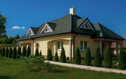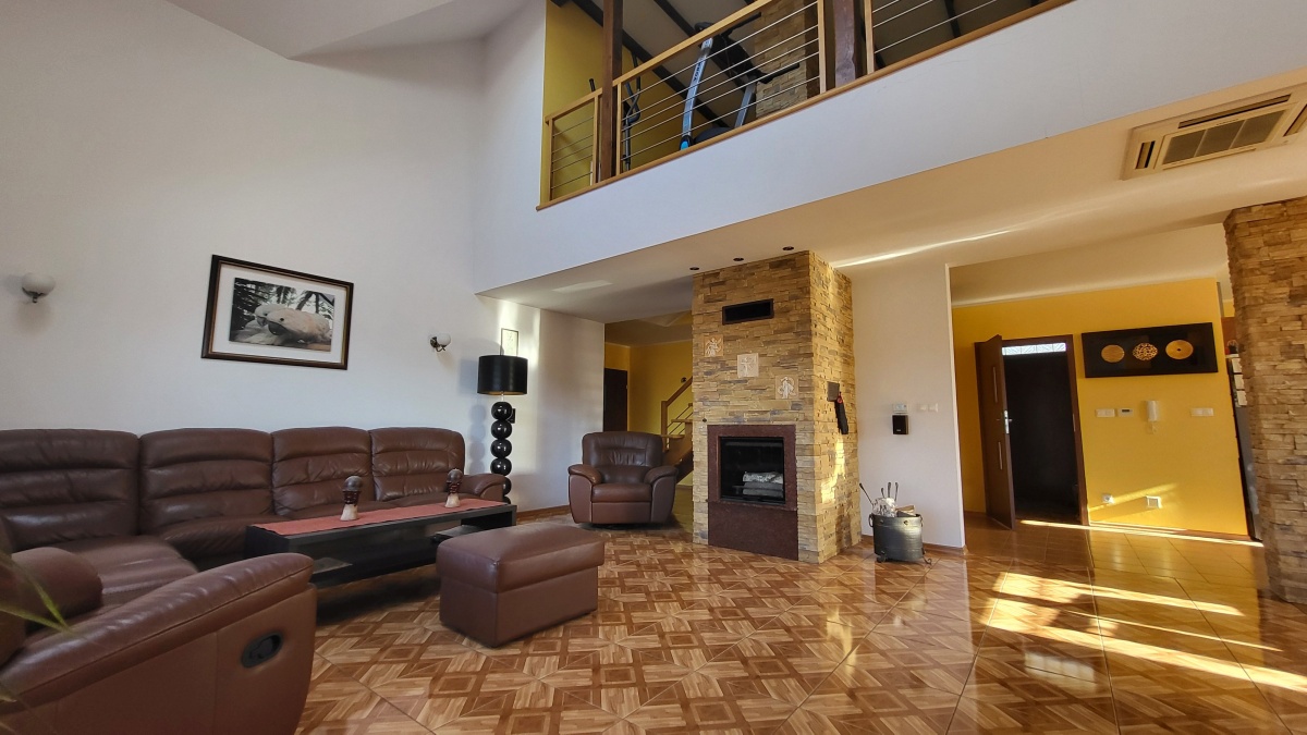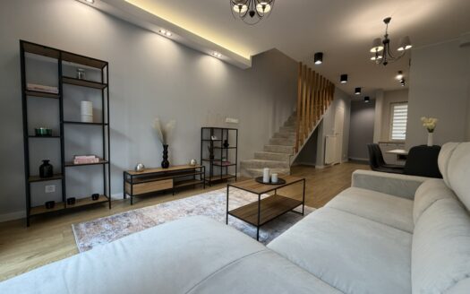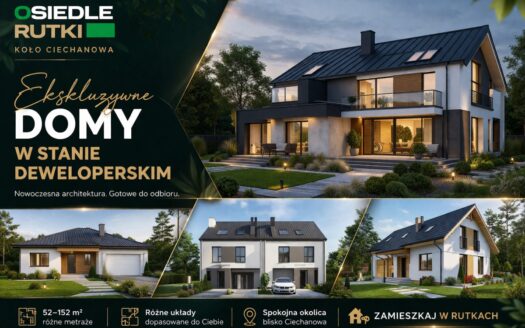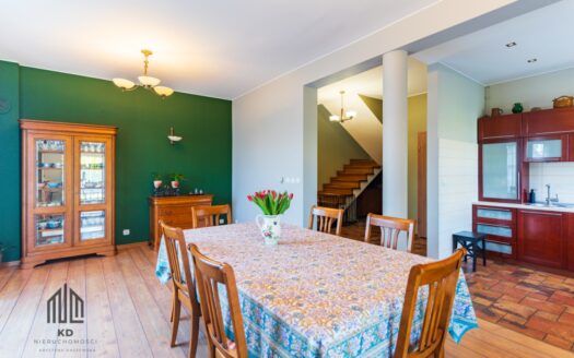 Dom z przyłączem do wszystkich mediów z bezpośrednim dostępem do asfaltowej i oświetlonej drogi gminnej. Wybudowany w roku 2012 na kwadratowej działce o powierzchni 1000 m2. Dom jest ogrodzony przęsłami kutymi z czterech stron. Budynek składa się z 3 pokoi i dużego salonu z antresolą oraz aneksem kuchennym i jadalnią. Kominek z płaszczem wodnym oraz buforem ciepła o pojemności 1000 litrów z pełną automatyką. Pozostałe pomieszczenia na parterze to pokój, wiatrołap, łazienka oraz pomieszczenie gospodarcze prowadzące do garażu. Na piętro prowadzą dębowe ażurowe schody, gdzie znajdują się 2 sypialnie i duża łazienka, oraz duże pomieszczenie obecnie adoptowane na pralnię z suszarnią. W wydzielonej części holu znajdują się przyrządy fitness (bieżnia, rower eliptyczny firmy York). Jedno z okien dachowych (Velux) nad salonem jest sterowane pilotem z czujnikiem deszczu. Wszystkie 3 pokoje oraz salon posiadają klimatyzację (multisplit Samsung). We wszystkich pomieszczeniach na parterze jest ogrzewanie podłogowe. Obie łazienki mają również ogrzewanie podłogowe oraz kaloryfery drabinkowe. W pomieszczeniu gospodarczym zainstalowana jest stacja zmiękczania wody (cała armatura grzewczo hydrauliczna firmy Viessmann). Bezpośrednio z jadalni wychodzi się na wielki 56 m taras (częściowo zadaszony) z cudownym widokiem na las. Dom wyposażony jest także w odkurzacz centralny oraz garaż dwustanowiskowy. Na dachu budynku zamontowany jest próżniowy panel solarny do podgrzewania wody użytkowej. W ogrodzie jest domek na narzędzia i drewutnia. Działka posiada automatyczne nawadnianie ogrodu (Gardena) oraz siatkę przeciw kretom na całej powierzchni trawnika. Na działce wydzielone jest również miejsce na ognisko. Nad bezpieczeństwem czuwa alarm trzystrefowy (czujki wewnętrzne, kontaktrony w oknach i czujki zewnętrzne). Wyposażenie domu częściowo podlega sprzedaży wraz z domem, szczegóły do uzgodnienia.