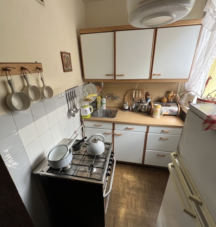 Mieszkanie składa się z dwóch pokoi, kuchni, łazienki, przedpokoju. Mieszkanie znajduje się na pierwszym piętrze. Z dużego pokoju wyjście na balkon.
