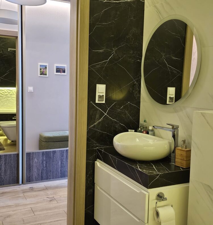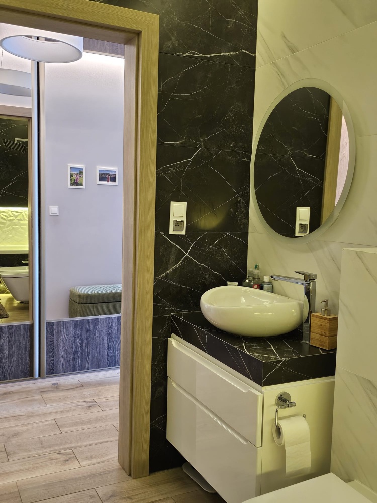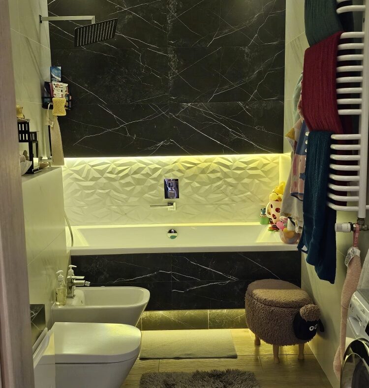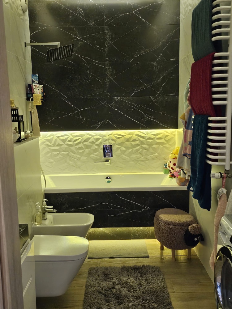 Nowoczesna łazienka z wanną, prysznicem z termostatem, bidetem, pralko-suszarką oraz ogrzewaniem podłogowym,