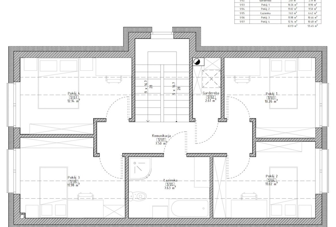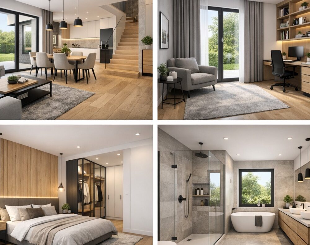 Funkcjonalny układ pomieszczeń: Przestronny salon z jadalnią, jasna kuchnia, spiżarnia, 4 sypialnie, 2 łazienki, garderoba i pomieszczenie gospodarcze – wszystko zaprojektowane z myślą o komforcie rodziny.