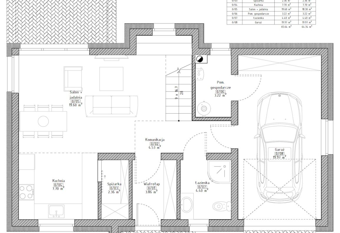Garaż w bryle budynku: 19,97 m² – idealne miejsce na samochód i dodatkowe przechowywanie.