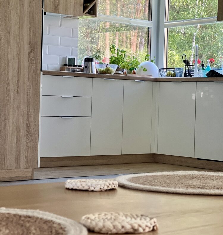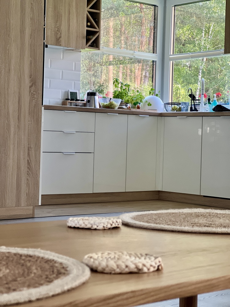 Przestronna kuchnia (Blum, GTX) z oknem narożnym, widokiem na ogród i nowoczesnym wyposażeniem to serce domu – tu rodzą się rodzinne historie. Jasne, przytulne wnętrza i detale, jak artystyczna fototapeta, tworzą przyjazną przestrzeń.
