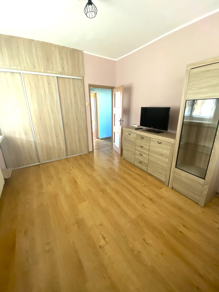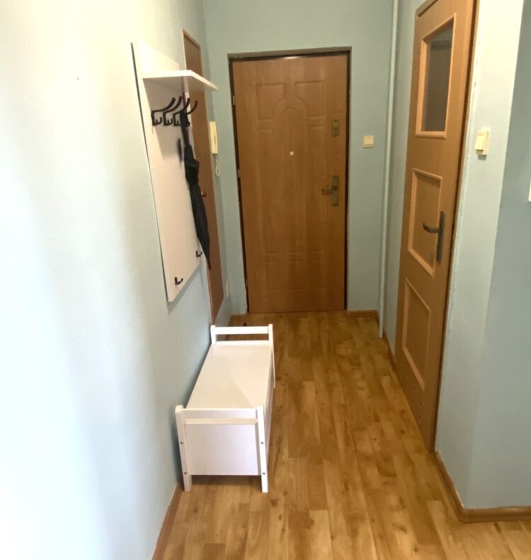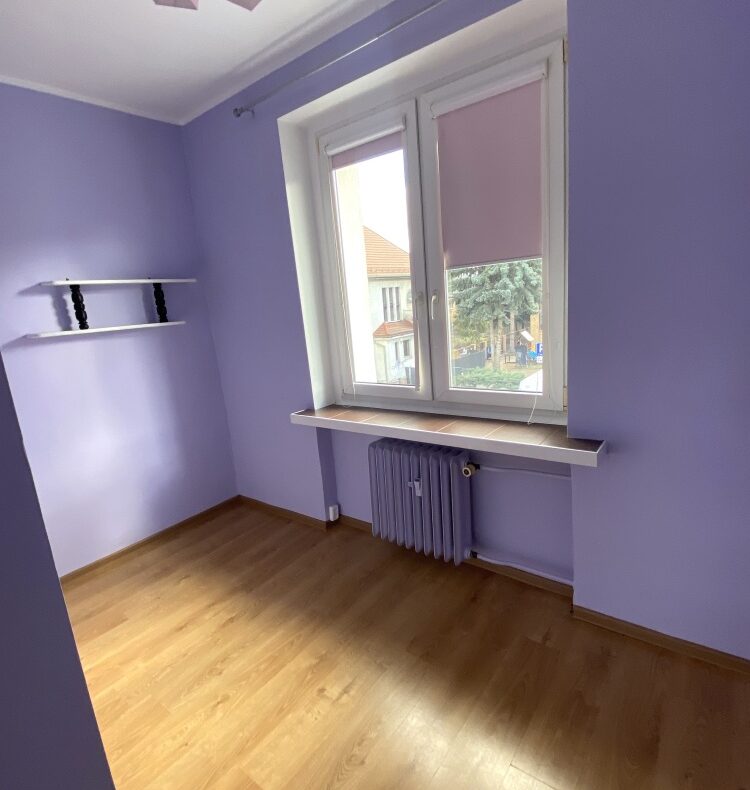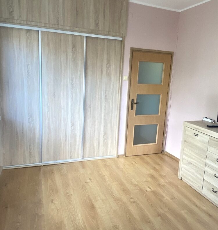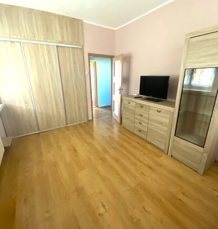 W pokojach na podłodze panele podłogowe, w kuchni i przedpokoju wykładzina PCV.