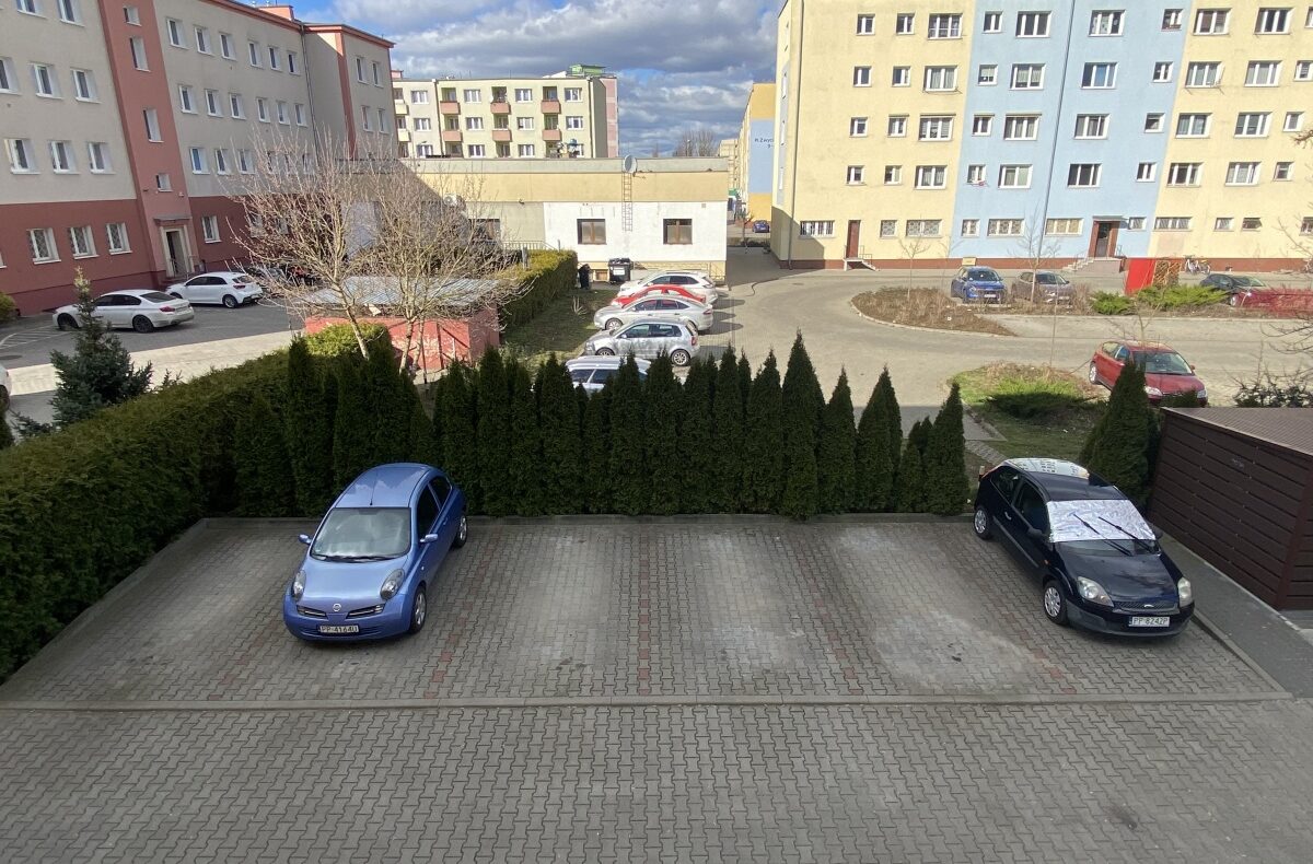 Prywatny parking dla mieszkańców wspólnoty przy budynku, odgrodzony szlabanem na pilota.