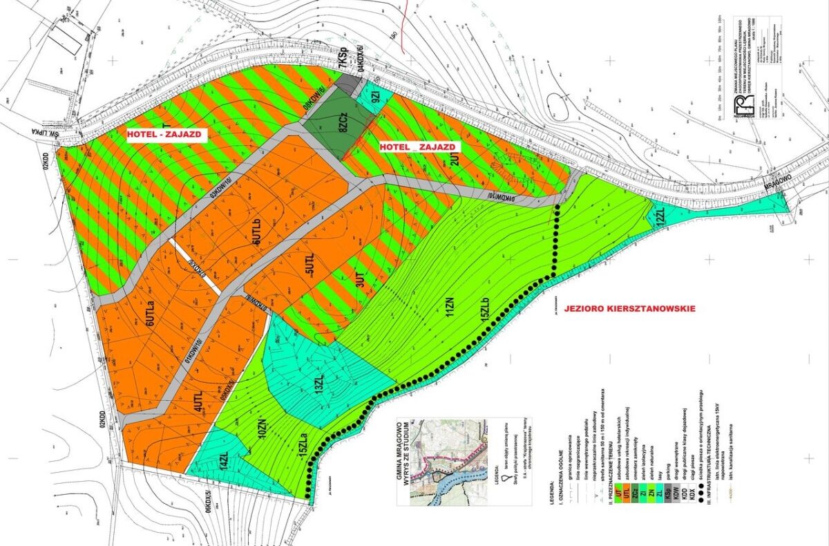 Dla całego terenu opracowany i uchwalony został Miejscowy Plan Zagospodarowania Przestrzennego. Działka oznaczona w planie symbolem 1UT przeznaczona jest w nim na cele zabudowy turystycznej i została już geodezyjnie wydzielona. Oznacza to, że natychmiast po wykonaniu projektu można przystąpić do budowy hotelu, motelu, zajazdu, zespołu domków letniskowych, campingu lub pola namiotowego.