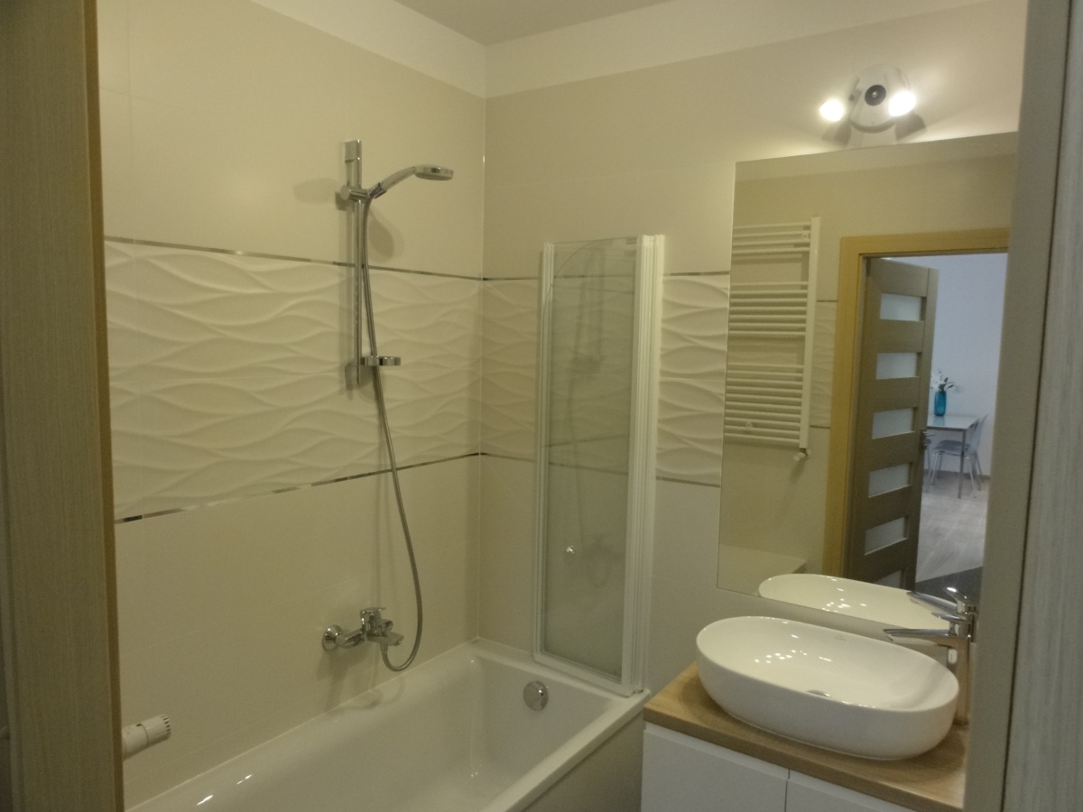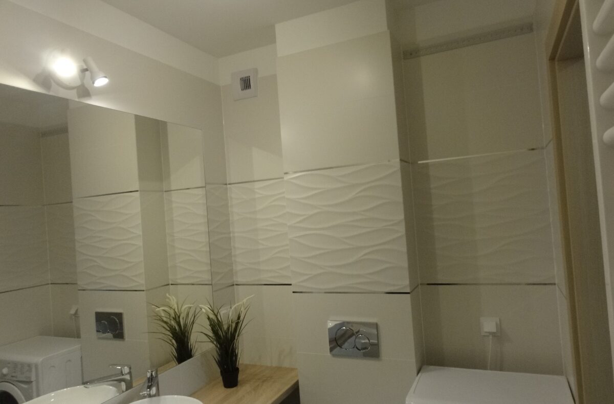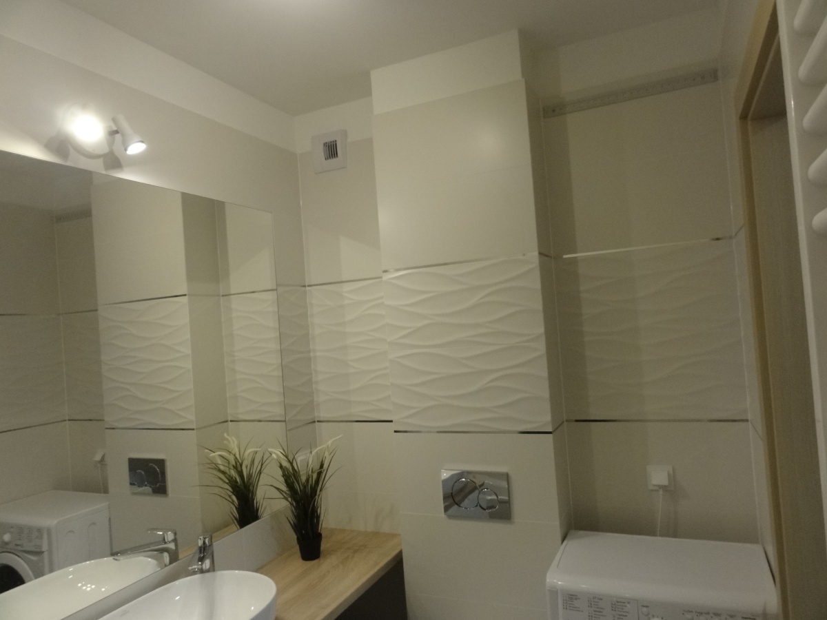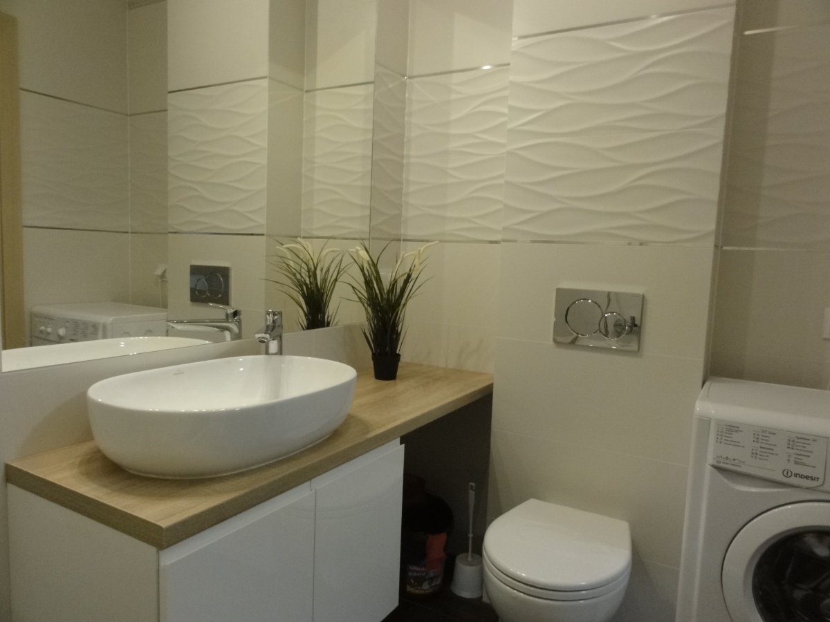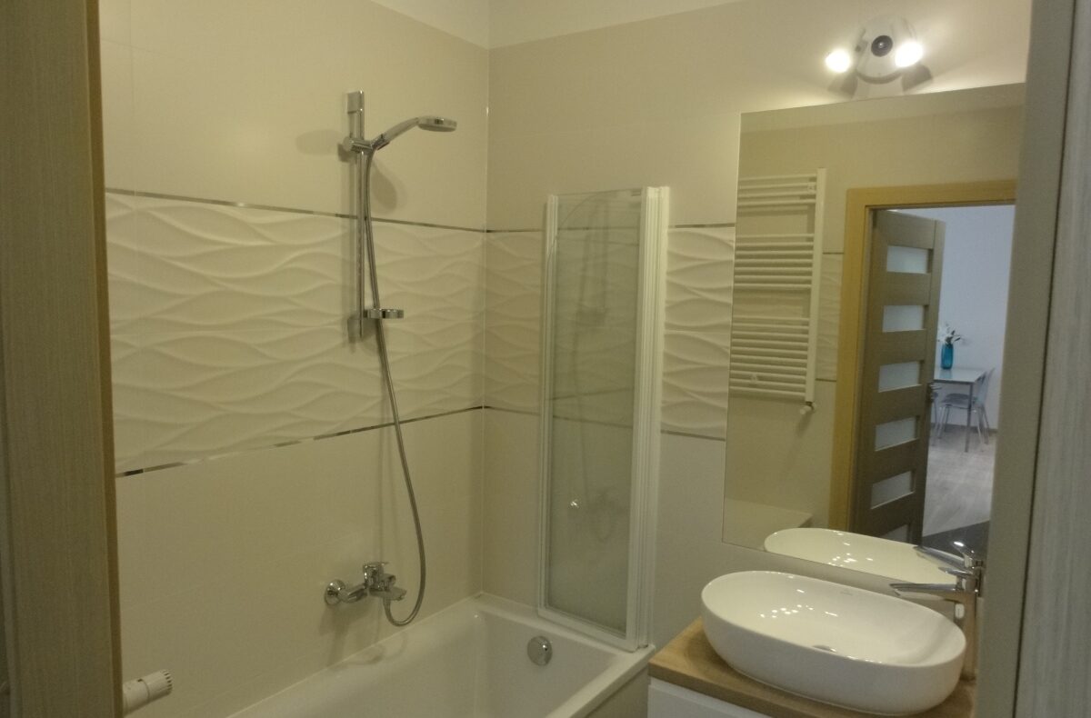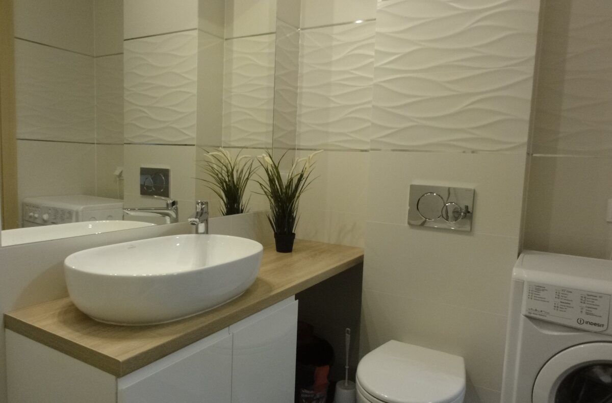 – łazienki z wanną i parawanem oraz szafkami i pralką,
