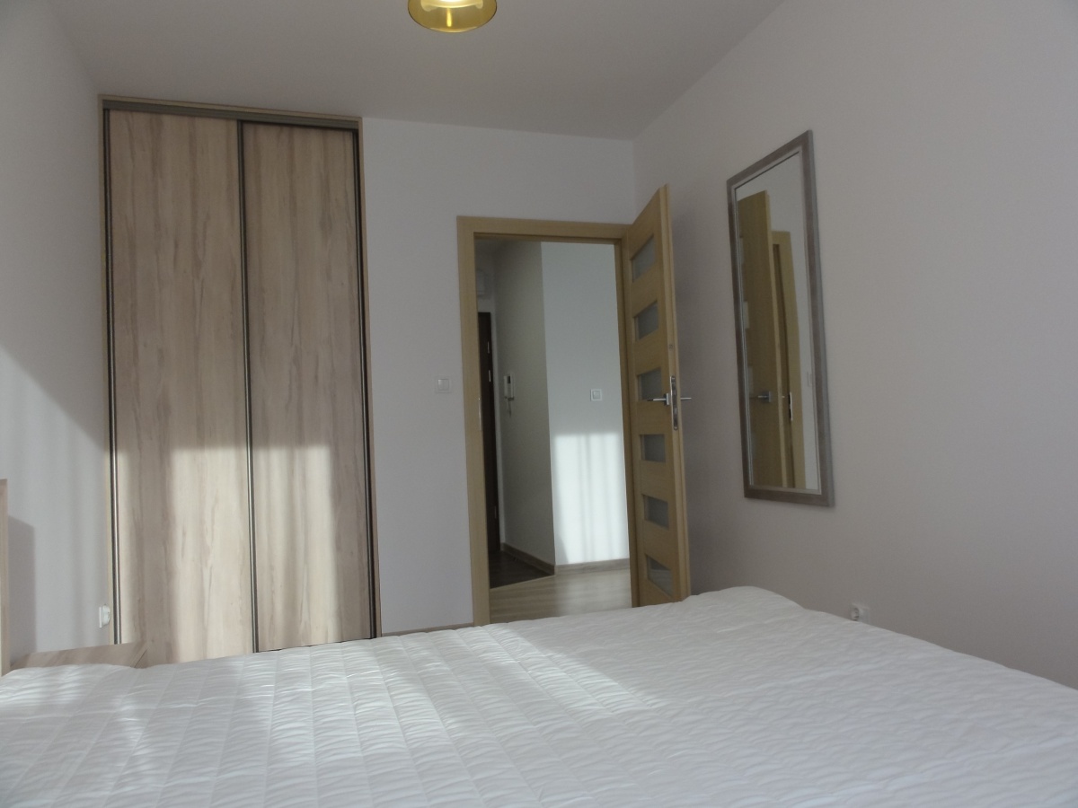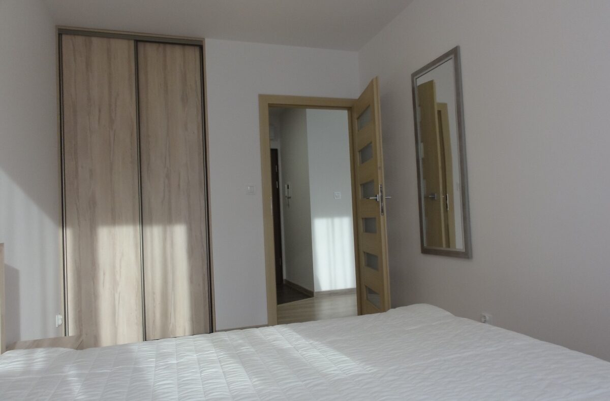 – sypialni z szerokim, wygodnym podwójnym łóżkiem, szafkami nocnymi, przestronną szafą wnękową i lustrem