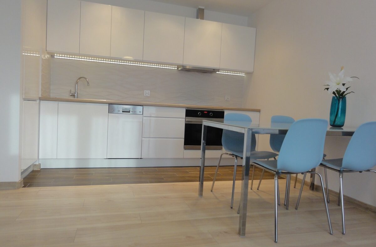 – salonu wyposażonego w rozkładaną sofę połączonego z aneksem kuchennym w pełni wyposażonym w sprzęt AGD (lodówko- zamrażarka, zmywarka, piekarnik, płyta grzewcza z wyciągiem kuchennym),