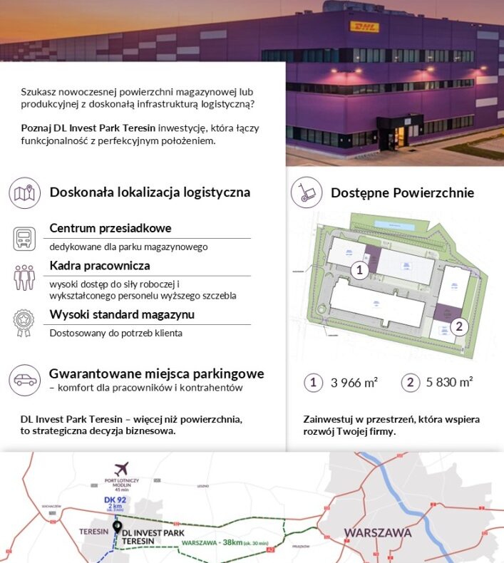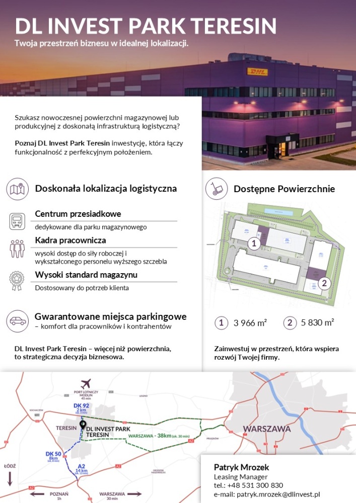 DL Invest Group, jedna z wiodących firm działających na rynku nieruchomości komercyjnych w Polsce, oferuje do wynajęcia nowoczesne powierzchnie magazynowe zlokalizowane w Teresinie, w ramach naszego parku logistycznego.
