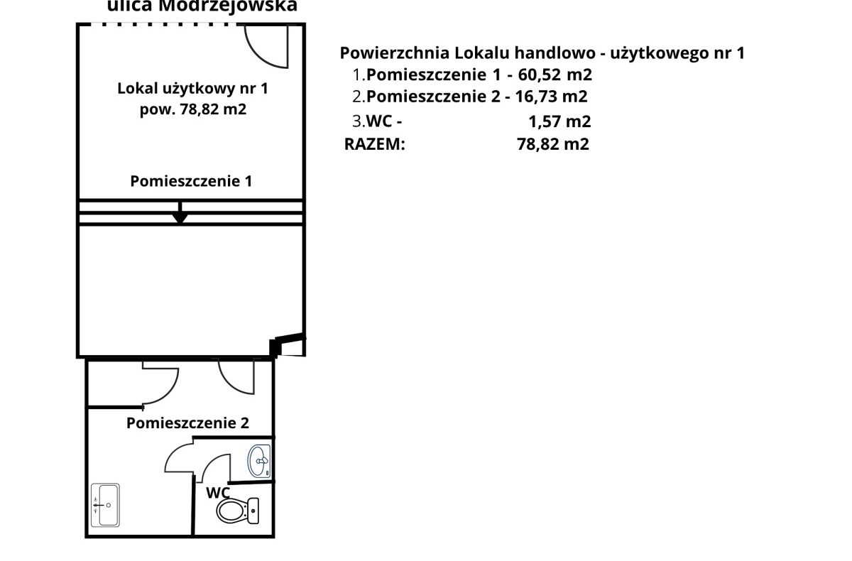 Lokal składa się z : Pomieszczenie nr 1 (Sala sprzedaży) – 60,52 mkw., Pomieszczenie nr 2 (Zaplecze) – 16,73 mkw., WC – 1,57 mkw.